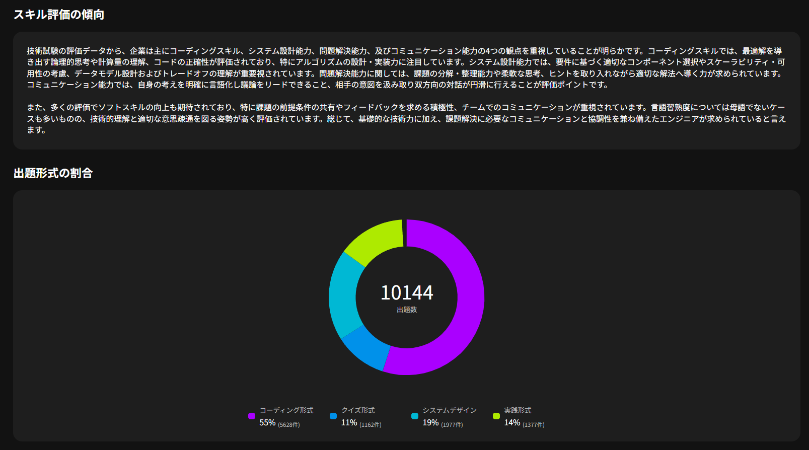 - 選考で出題された問題形式(例:アルゴリズム、クイズ、システムデザイン、実務形式)を集計し、割合を可視化します。