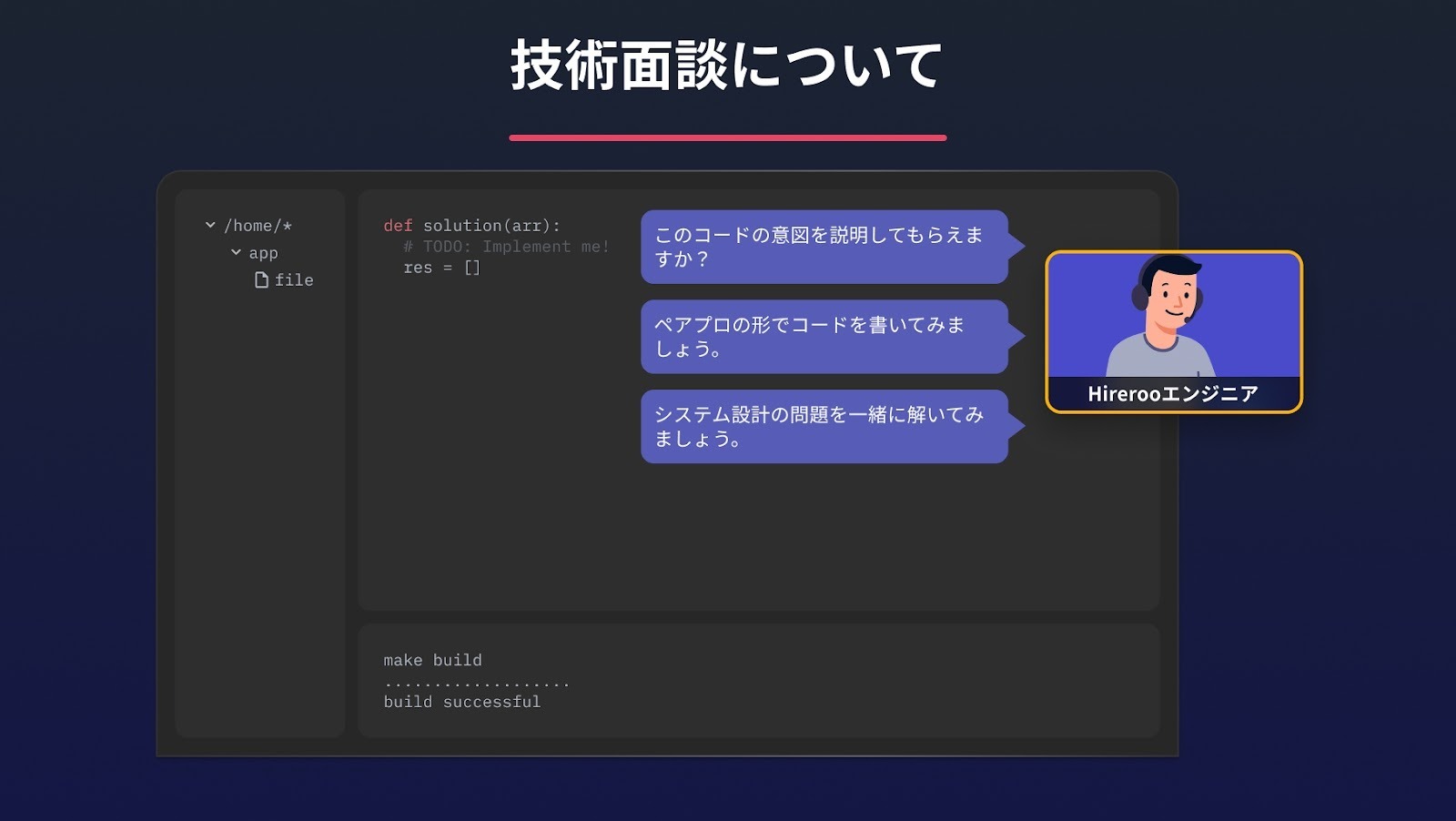 この技術面談では、ハイヤールーに所属する現役エンジニアが担当者として参加し、ペアプログラミング(ペアプロ)の形式で実施します。課題を一緒に解きながら、実際の開発現場に近い形で思考のプロセスや判断を伺うことで、コードを書くだけでは見えにくいスキルを可視化します。