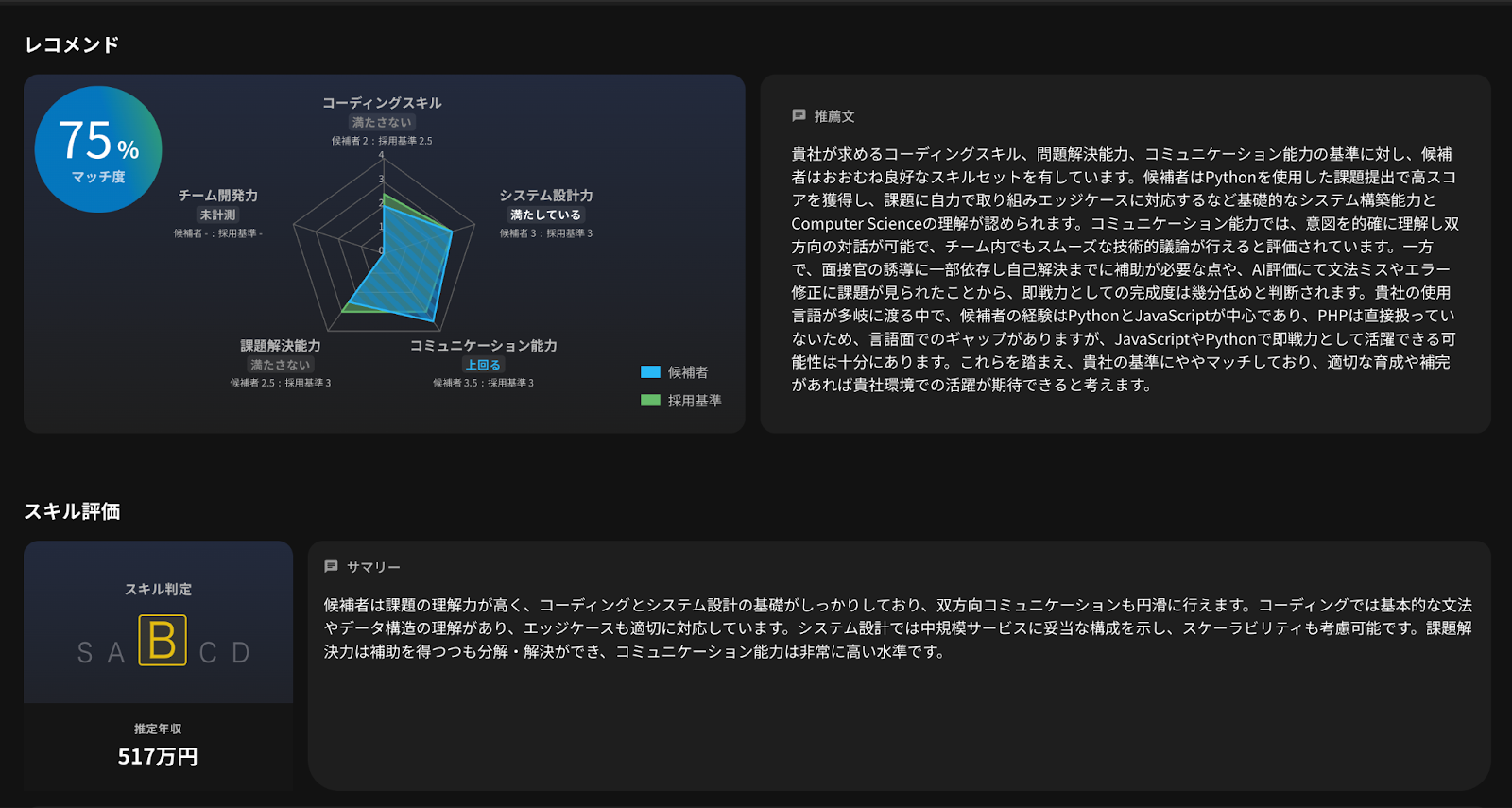 技術面談は、Skill Hiringのコンペに参加された方の中で、一定のスコアを出した方を対象にご案内しています。コンペでのスコアや提出コードだけでは判断しきれない「チーム開発力」「システム設計力」「コミュニケーション能力」などをより正確に把握し、書類では伝わらない魅力を引き出し、スキルレポートとしてまとめることを目的としています。