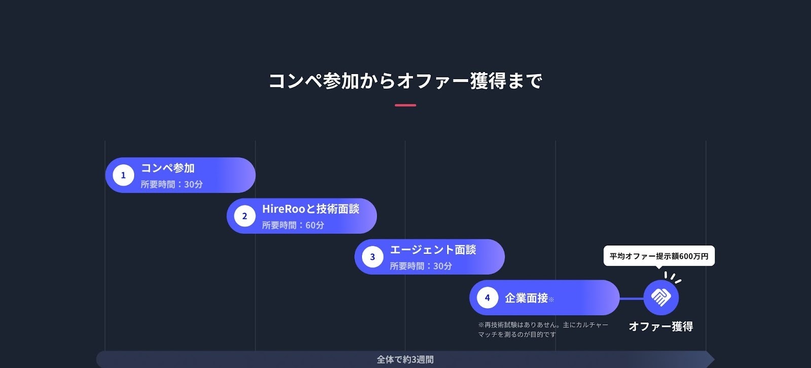 Skill Hiringのコンペ型転職では、コンペに参加していただいた方にさらにスキルの可視化をしたく、コンペでのコーディング試験に加えて「技術面談」というステップを設けています。